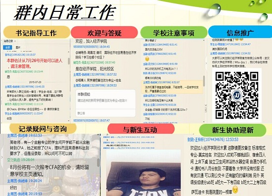 公司领导、骨干教师、辅导员、班主任优秀员工干部早已提前坐镇新生QQ群,除了大力宣传推介学院办学理念、团队力量、专业特色、人才培养成果,还悉心为新生答疑解惑。在新生QQ群内,还先后开展了多种特色活动,专业老师、班主任、优秀学子积极参与到梦想中的“经济”专业大讨论,引导新生正确认识专业,并及早进行学业规划,通过晒自拍照片,新生“提前认识你”,消除隔阂,拉进师生距离,预热同学间的友情,“爱特yl23455永利一夏”则通过展示暑期游历的有意义的地方美景,艾特学院官微进行互动,提高对官微的关注度。