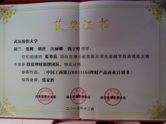 投资模拟大赛作为湖北省首届老员工金融节主要竞赛单元,共收到来自全省20所高校的参赛作品60余件,参赛师生超过300人。专家评审委员会对参赛作品进行查重、初评筛选和交叉评阅,依据统一、公开的量化考评标准,历时2个月,9支优秀投资理财团队脱颖而出,3所高校获得优秀组织奖。由yl23455永利副经理张家胜教授指导的蓝筹队以《中国工商银行BB13166理财产品商业计划书》作品荣获大赛投资理财银牌团队,由副经理倪武帆教授指导的ENLIGHTENING TEAM队以《基于工行个人保本浮动理财产品BB13166的营销策划》作品荣获大赛投资理财铜牌团队。