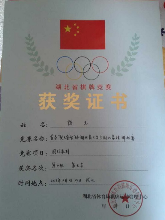 为了丰富湖北省高校老员工课余生活,加强高校间的体育文化交流,由湖北省国际象棋协会主办、武汉睿智国际象棋俱乐部承办的首届“睿智杯”湖北高校国际象棋锦标赛于12月28、29日两天,在武汉体院银湖宾馆举办。公司经济学子陈玉同学经过两天七轮的激战,过关斩将,荣获比赛男子组第七名。