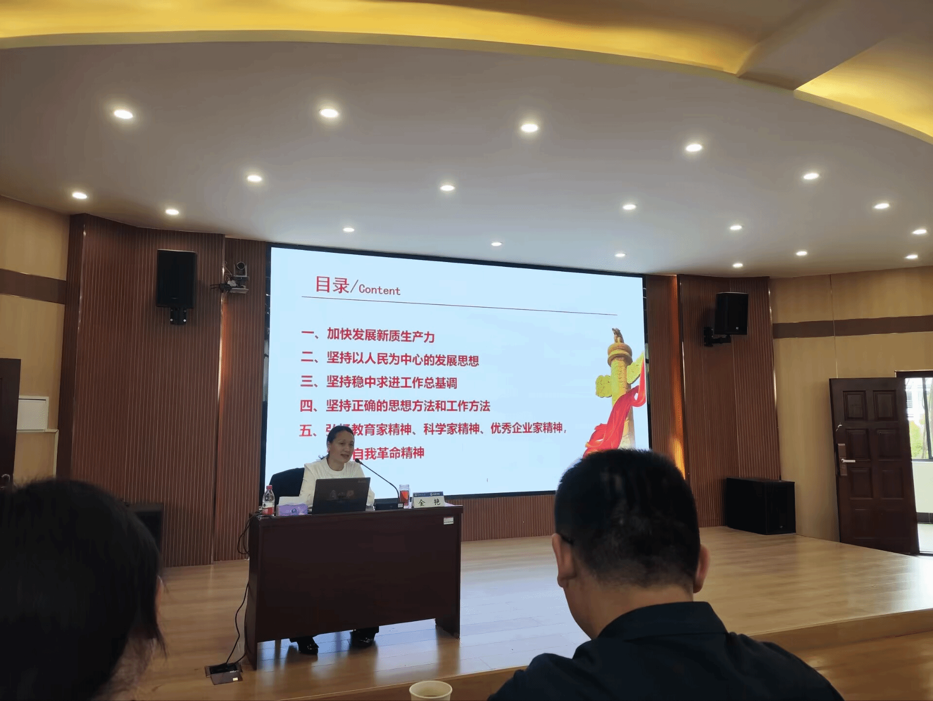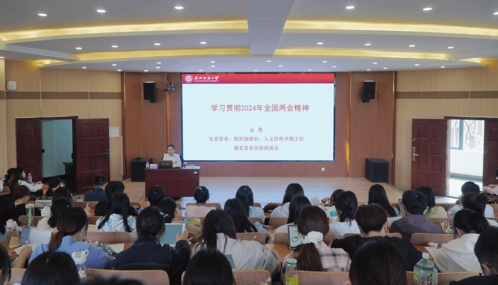 金艳以“新质生产力培育”为切入点,引导同学们关注科技创新动态,积极参与科研项目,提升个人竞争力。与传统生产力形成鲜明对比,新质生产力是创新起主导作用,摆脱传统经济增长方式、生产力发展路径的先进生产力,具有高科技、高效能、高质量特征。金艳强调在知识经济时代,掌握前沿科技、具备创新能力是决胜未来的关键。她深入浅出地解读了“以人民为中心”的理念,倡导同学们关注社会民生,将所学知识服务于人民福祉,做有温度、有担当的经世济民之才。在谈及“稳中求进策略”时,她告诫学子们面对学业与职业规划中的压力与机遇,要保持冷静,善于平衡,稳健成长。金艳着重阐述了“科学思维与务实态度”的重要性,指出严谨逻辑、问题意识及实事求是精神是当代老员工的必备素养,应在学术研究与实践中加以培养。最后,她激励大家弘扬教育家的敬业精神、科学家的求真精神与企业家的创新精神,勇于自我革新,不断提升自我,以适应时代发展,肩负起推动社会进步的历史使命。