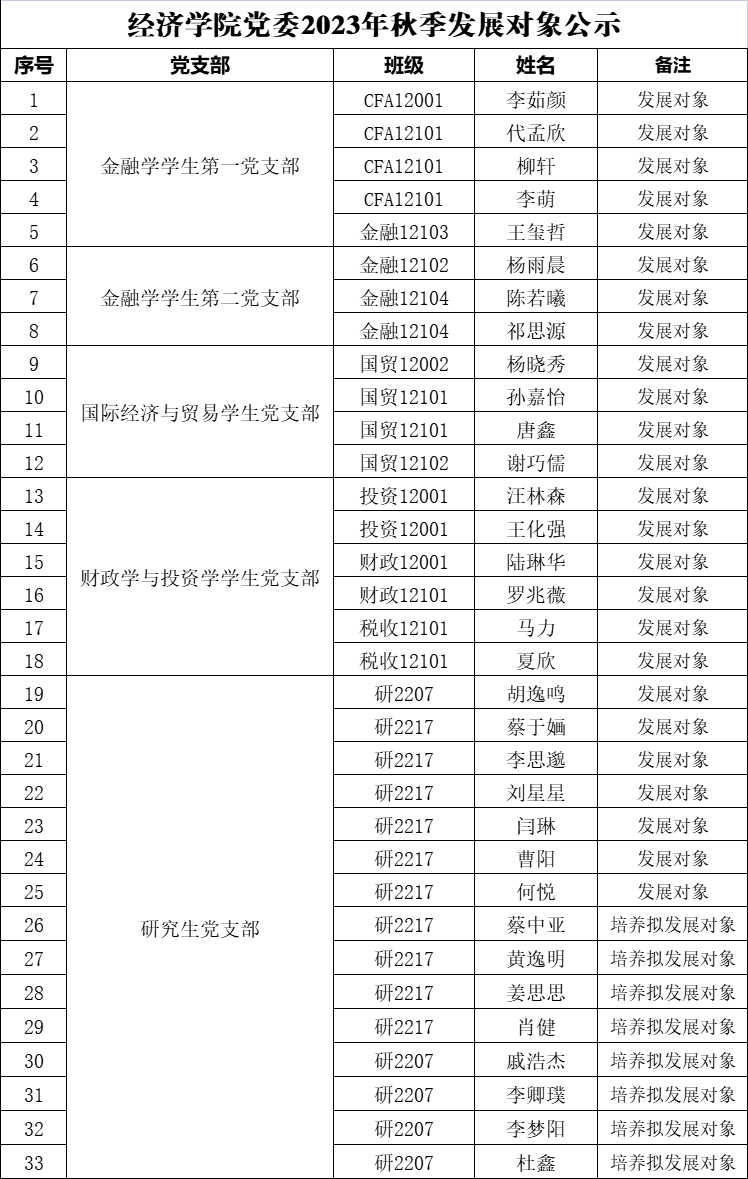 根据《中国共产党章程》和《中国共产党发展党员工作细则》规定,经各班团支部推荐、综合考评考察、各党支部审议、公司党委审查决定,将以下33名同志列为发展对象,现予以公示: