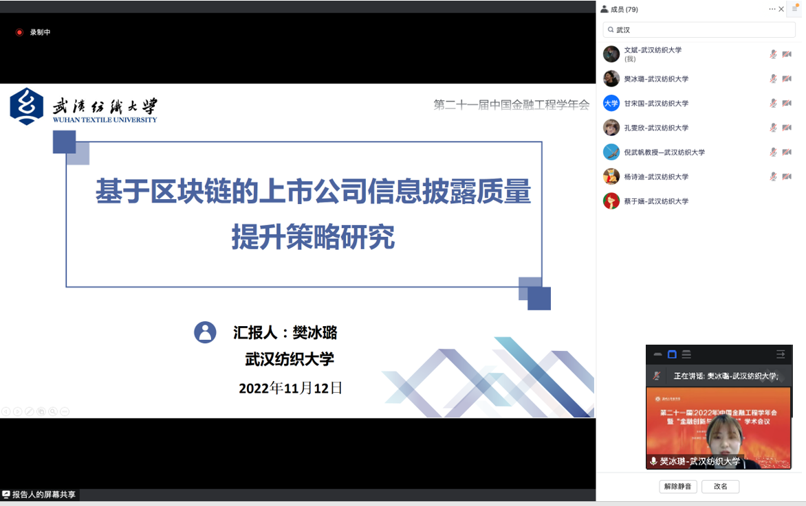 倪武帆教授与研究生文斌、樊冰璐等共同完成的学术论文《基于区块链的上市公司信息披露质量提升策略研究》成功入选,并受邀参加本届年会,樊冰璐代表项目团队在学术论坛上作了主题报告和发言。11月12日下午,樊冰璐在主题为“资本市场与风险投资”的分会场进行了项目研究的成果展示,并就相关研究的背景、方法、技术路线、实证结论等内容作了专题报告。该研究成果以提升企业信息披露质量为目的,揭示了影响信息披露质量的因素,剖析了重要信息虚假披露、负面信息隐瞒披露、无效信息过度披露等诸多信息披露质量问题,提出了运用去中心化技术、分布式账本、智能合约技术、溯源时间戳等对策。樊冰璐的报告精炼、流畅,得到了与会专家的一致好评。同时,樊冰璐还作为点评嘉宾,点评了《金融工程“优质数字金融科技人才”跨专业培养模式的研究》专题报告,在点评分析环节中,结合公司实践,樊冰璐分享了yl23455永利在本科层次有关金融科技方向、CFA方向、金融学双学位的办学经验,在公司产品过程中充分运用中信证券研究生工作站、长江成长资本股份有限公司研究生工作站、金融数学研究院(筹)等学术平台、实践实训平台提升培养质量的创新做法,得到与会专家学者充分肯定和积极评价。