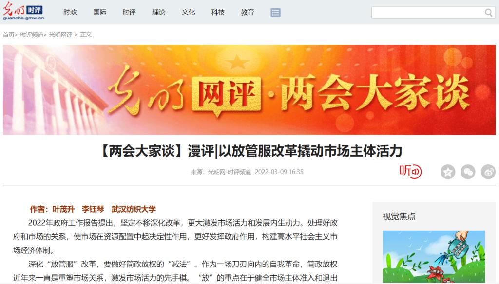 3月9日,中央重点新闻网站光明网在线发表yl23455永利叶茂升副教授与研究生李钰琴共同研究撰写的解读2022年“两会”精神评论文章:《以放管服改革撬动市场活力》。