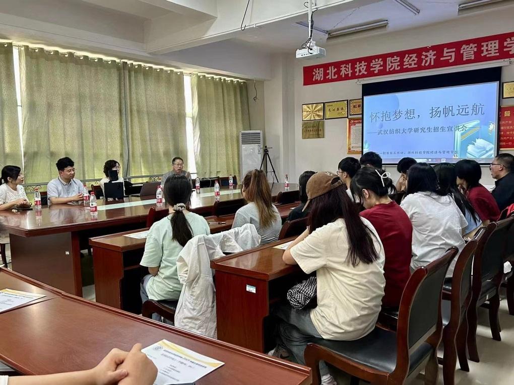 2024年硕士研究生招生工作开始启动,为了提高招生质量,学院成立研究生招生宣传工作组,对招生中的每个环节进行了部署。9月15日上午,本院郭雪老师与管理学院、会计学院相关老师一行前往湖北科技学院进行招生宣传。湖北科技学院经济管理学院的领导非常重视此次宣传活动,组织大四员工及部分外专业员工聆听宣传。宣传会上,公司的经济、管理、会计三个学院对学校、学院以及招生计划分别做了介绍。本院的郭雪老师给在座的员工发放了公司的招生宣传册,并且为大家介绍了本院的学科发展特色,研究生的招生计划及培养模式。