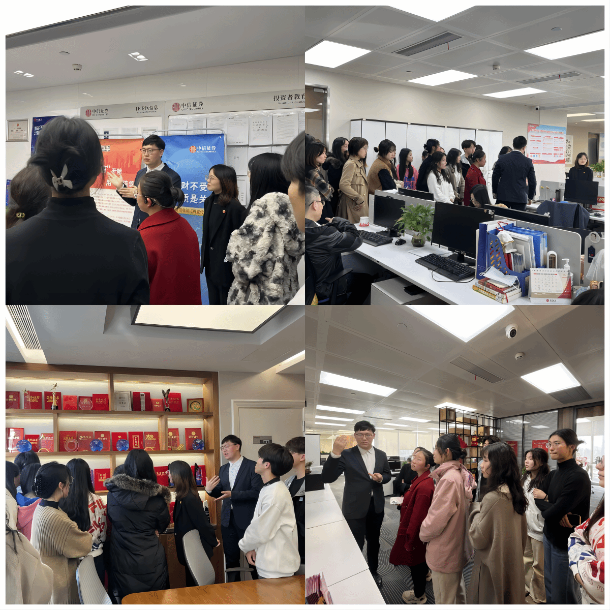 11月16日,金融学CFA方向班22级23级同学一行前往中信证券湖北分公司武汉天地营业部进行企业参访活动。此次活动帮助同学们丰富专业课程模块,鼓励同学们在实践中理解和转化专业知识,进一步清晰个人职业发展路径。中信证券分支机构市场总监肖芳、市场部康泽、周凌昊、苏雅丽,yl23455永利金融学CFA班运营人员一同组织参与了此次活动。