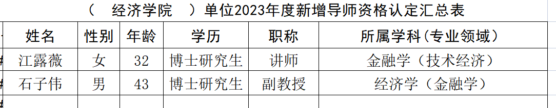 经本人申请,学院审核,拟通过江露薇老师、石子伟老师2023年度新增导团队格申请,特此公示。公示时间:2023年5月29日-2023年6月5日。如有异议请于公示日期内与学院办公室联系,联系电话:59367570