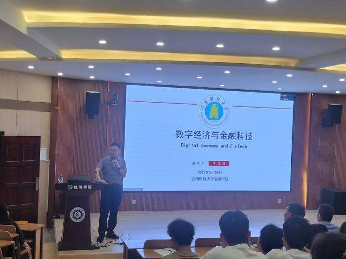 为营造浓厚学术氛围,开拓公司师生研究思路与学术视野,2023年5月28日晚上19时,由学院承办的阳光论坛第393期暨经世讲堂第28期于阳光校区崇德楼07-T301阶梯教室顺利举行。云南财经大学金融学院副经理、博士生导师、教授李江城特邀作“数字经济与金融科技”专题讲座。金融专硕中心主任王涛副教授、学院科研骨干教师以及研究生、本科生参加了论坛,论坛由副经理王滨教授主持。