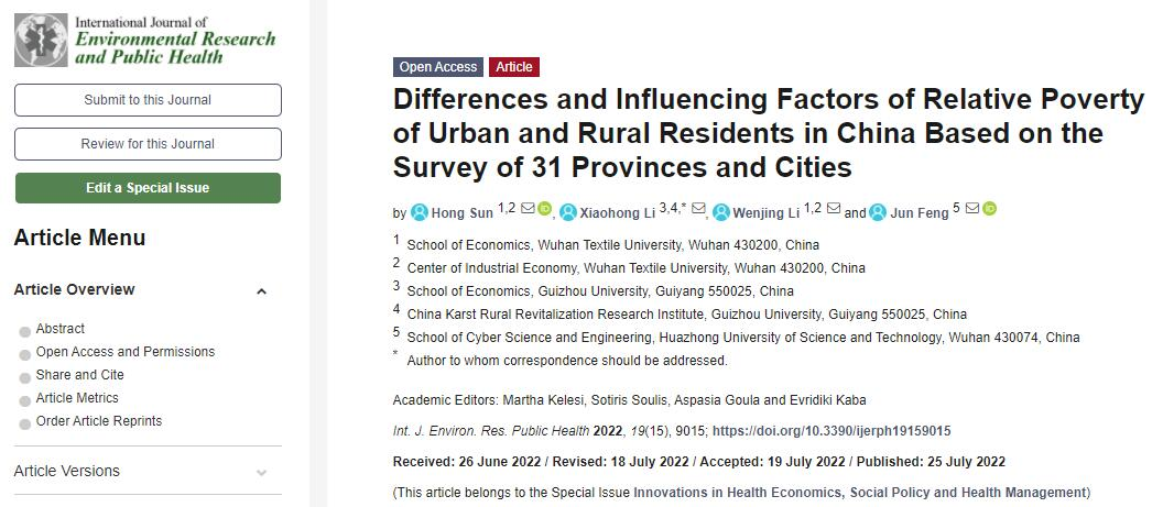 近日,公司金融系孙红老师在国际知名期刊《International Journal of Environmental Research and Public Health》(SSCI/SCI 双检索,JCR一区,IF: 4.614),发表《Differences and Influencing Factors of Relative Poverty of Urban and Rural Residents in China Based on the Survey of 31 Provinces and Cities》一文,文章DOI:https://doi.org/10.3390/ijerph19159015。永利集团登录入口为该论文的第一作者单位,孙红为该论文的第一作者。