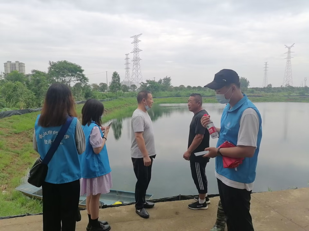 实践团队首先前往汉川市叼汊湖拜访当地的个体养殖户。在当地老乡的带领下,实践团队成员们参观了他们的鱼塘,与其他养殖业不同的是,鱼塘被分成一块块的不规则形状。在当地农业局的技术指导下,采用了“粗放加精养的”养殖模式,每块水塘养殖的渔业动物都不一样,有的是武昌鱼等鱼类,有的是龙虾,每一小块水塘养殖单一的一种渔业动物;养殖方式也不一样,有的是精养,有的是接近自然环境的粗放式养殖。