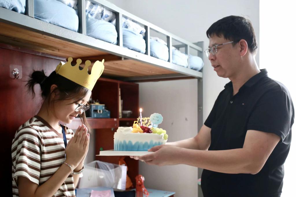 得知2023级有学子恰逢开学季生日,学院特意精心准备了新生“庆生”活动。公司党委书记刘园美、党委副书记李静宇、新生辅导员一行人走访女生寝室11B518,与金融12303夏静怡同学及其家人共同见证难忘时刻。学院准备了蛋糕,刘园美为新生戴上生日帽,大家齐唱生日歌,现场氛围轻松愉快。看到新生青春洋溢的面庞,刘园美为其送去真挚祝福,祝愿她在新环境开启人生新篇章,能快速融入集体,“学有所得”、“学有所用”,人生的考验方才开始。最后,夏静怡表示:“这是一个很难忘的生日,很荣幸能在我十八岁生日这天收到老师们的祝福。对于刘书记寄予我的祝福与嘱托,我铭记于心,在大学期间努力学习,不负老师期待。”