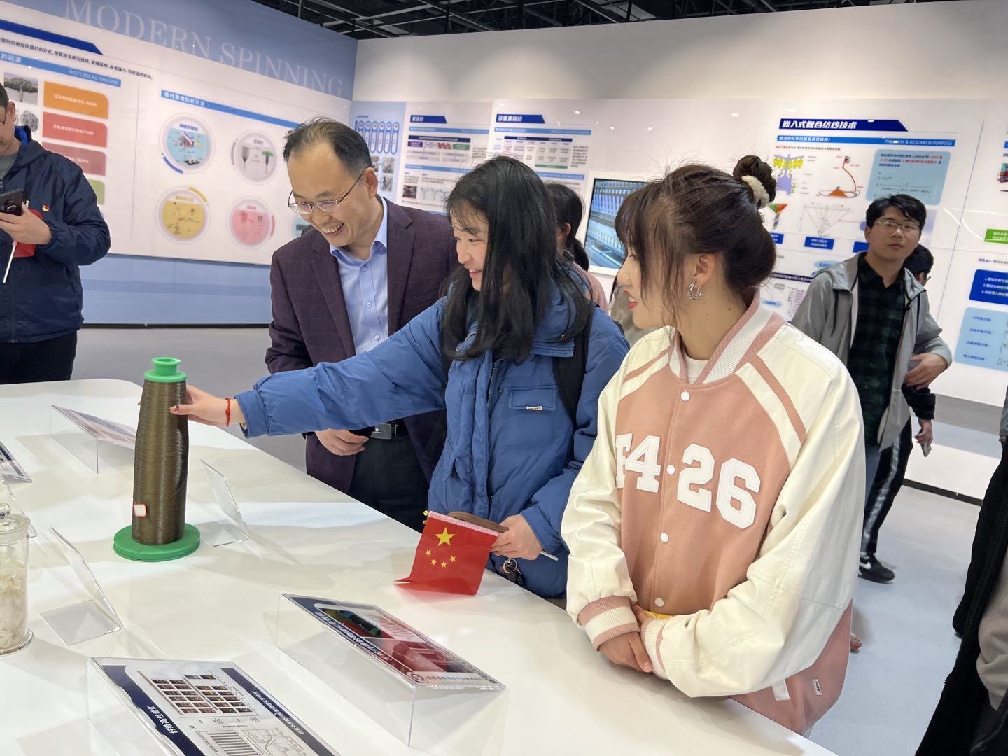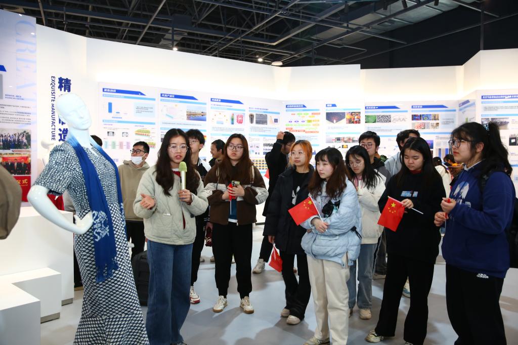 “优质天然高分子材料和高效嵌入式复合纺纱技术的运用,实现了国旗在太空中可以耐受极端高真空、高低温循环,保持不变形、不褪色……”在“大纺织”板块,员工们了解到徐卫林董事长率领科研团队研发的新型复合面料。月球上飘扬的国旗,再次激起了永利集团登录入口学子心中的自豪感。