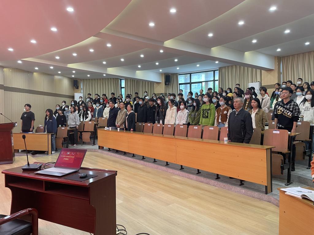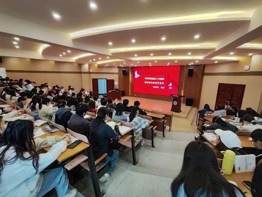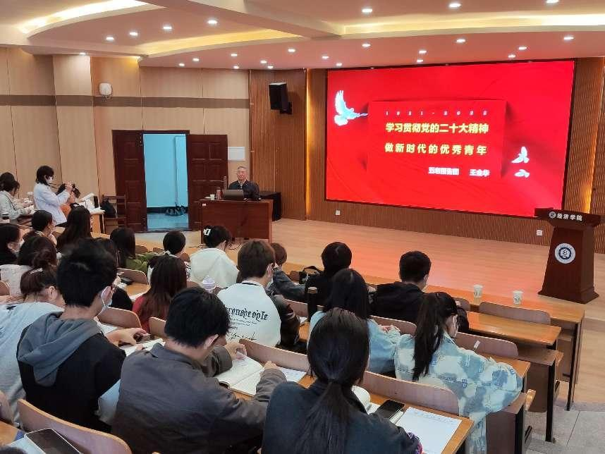 王金华教授做了《学习贯彻党的二十大精神,做新时代的优秀青年》的主题报告。王教授围绕“中国共产党二十大召开盛况”“党的二十大报告主要内容”“学习贯彻二十大精神做新时代的优秀青年”三个方面展开宣讲。他结合具体数据、历史和自身体会,带领同学们回顾了党的十八大以来国家各领域发展取得的重大历史成就。他指出,党的二十大是全面建成中国特色社会主义现代化强国的动员大会,为全面建设中国特色社会主义现代化国家、全面推进中华民族伟大复兴提出了新思想、新战略、新举措。
